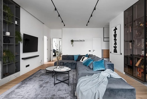 轨道灯在无主灯设计中最常见,自带黑色的轨道,是天花空间常用的线形元素。