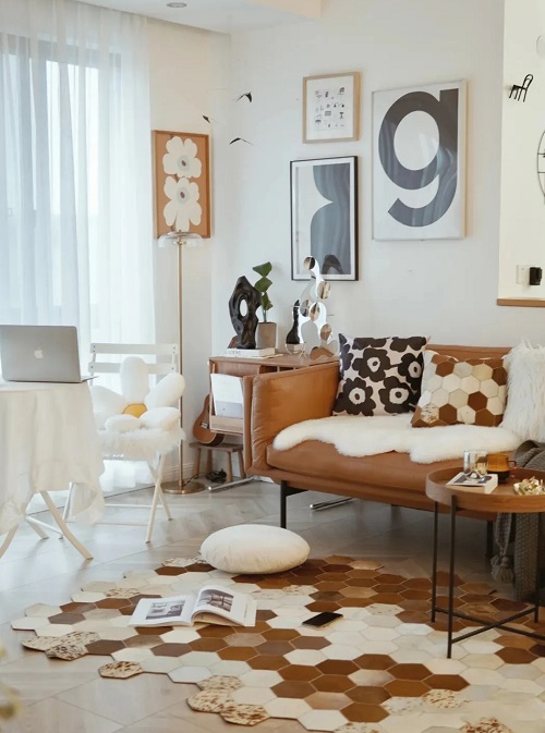 牛皮地毯比较耐磨还抗虫蛀,柔韧性和手感极佳,当然也吸音、保温,相比于羊毛材质,它更好打理。