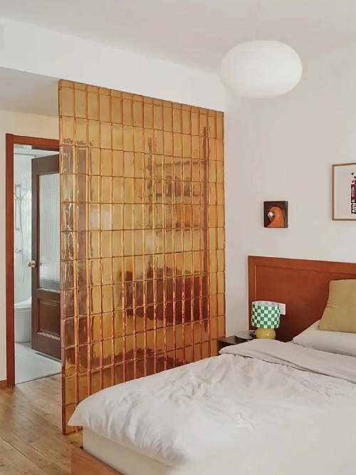 玻璃砖具有良好的透光性,对于采光不好的区域,引光线入室内,折射的光不会刺眼,柔和温馨,且能延伸空间视觉感。家里采光不好的地方都可以用玻璃砖打造非承重墙体或窗体,半透视的材料特性,运用于较为私密的空间也不会有困扰,清晰度和透明度自己把控。