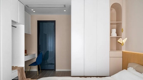 常见的卧室布局,靠近床头的衣柜规划开放格,即可满足日常床头收纳需求。