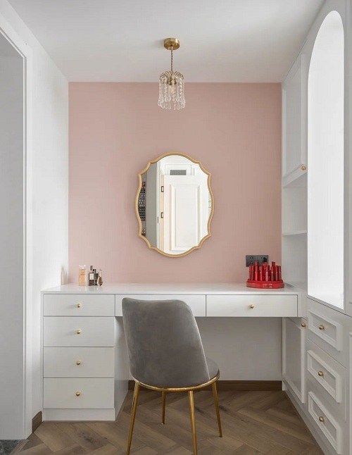 如果有衣帽间,衣帽间也是梳妆台的好归属,毕竟更衣梳妆动线最短。在衣帽间内,梳妆台要跟着衣帽间的布局走。