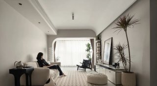 客厅整体以复古绿和浅灰色为主,搭配大株绿植,呈现一种清新简约的气质。保留挑高的空间,整面落地窗+白色垂帘拉伸层高,舒适韵律诠释居住的无限可能,纯白意味着光明和希望,小空间变得开阔自由。