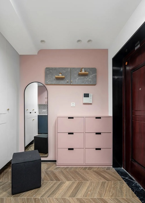 嵌入式鞋柜设计方法:玄关墙面是非承重墙的情况下,将墙体砸掉,现场木工将柜体嵌入墙体,减少面积占用。