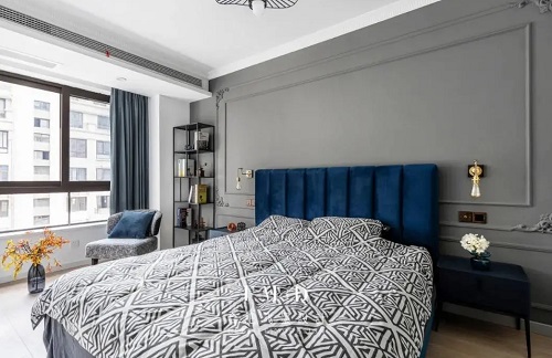 咱们床头背景墙其实还可以兼具储物的功能,可以做个隔板或置物架放在床头,一举两得。也可以做成柜子,拥有超大的储物空间。柜子的高度要设置好,避免出现床靠背挡住打不开的现象,柜子如果用来放衣物建议深度在60cm左右,中间如果留空,留空高度可以在45cm左右。