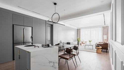 与老人同住的情况下,厨房一定要大,还要有互动性,这样不管是一起做饭,还是兼顾小孩都能得到满足。小厨房可将餐厅扩入或设计成开放式,大厨房可在厨房设计岛台或吧台来完善功能。客餐厅与厨房的互动性增强,动线得以优化,就算大人做饭也能实时关注小孩的动向。不能做开放式厨房的地区,可设计成半开放式,玻璃门拉开是开放式,关闭是封闭式。