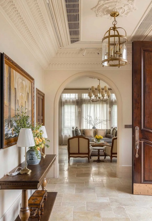 1、瓷砖+角花铺贴,随着美式田园风格的式微,这两年几乎也很少见到这种铺贴方式。