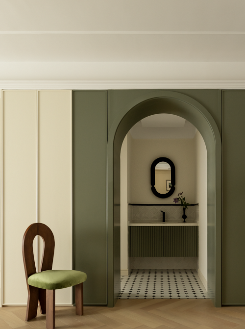 现在很流行的一种布局,就是简化主卫功能,划分一半空间去实现衣帽间。
